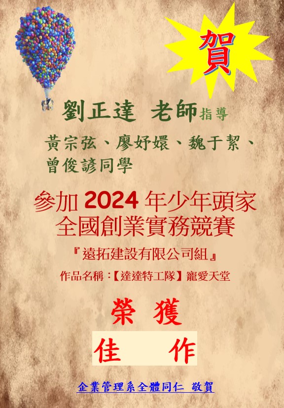【112榮譽榜】賀!劉正達老師指導本系黃宗弦,廖妤嬛,魏于絜,曾俊諺同學參加"2024年少年頭家全國創業實務競賽-遠拓建設有限公司組"榮獲佳作。...