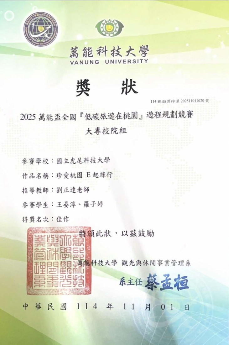 【114榮譽榜】賀!劉正達教授指導 學生 王晏淳、羅子婷 參加「2025萬能盃全國低碳旅遊在桃園遊程規劃競賽大專校院組」榮獲佳作