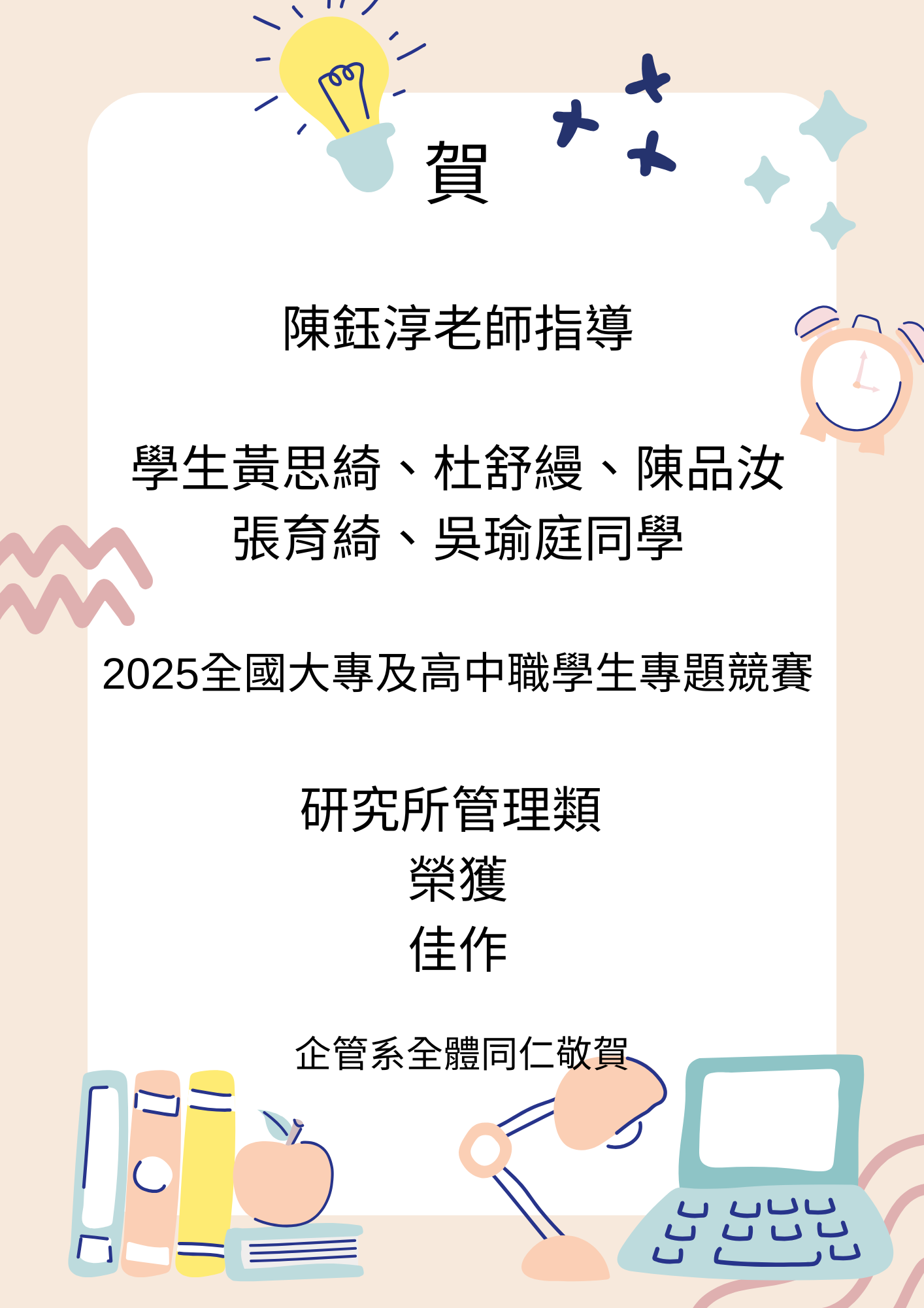 【114榮譽榜】賀!陳鈺淳老師指導 學生黃思綺、杜舒縵、陳品汝、張育綺、吳瑜庭同學 參加2025全國大專及高中職學生專題競賽 榮獲 研究所管理類 佳作